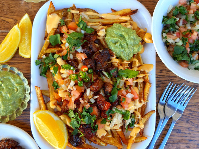 This indulgent dish is made up of skinny oven baked fries drenched in a smoky homemade cheese sauce, with tender chunks of pork belly...